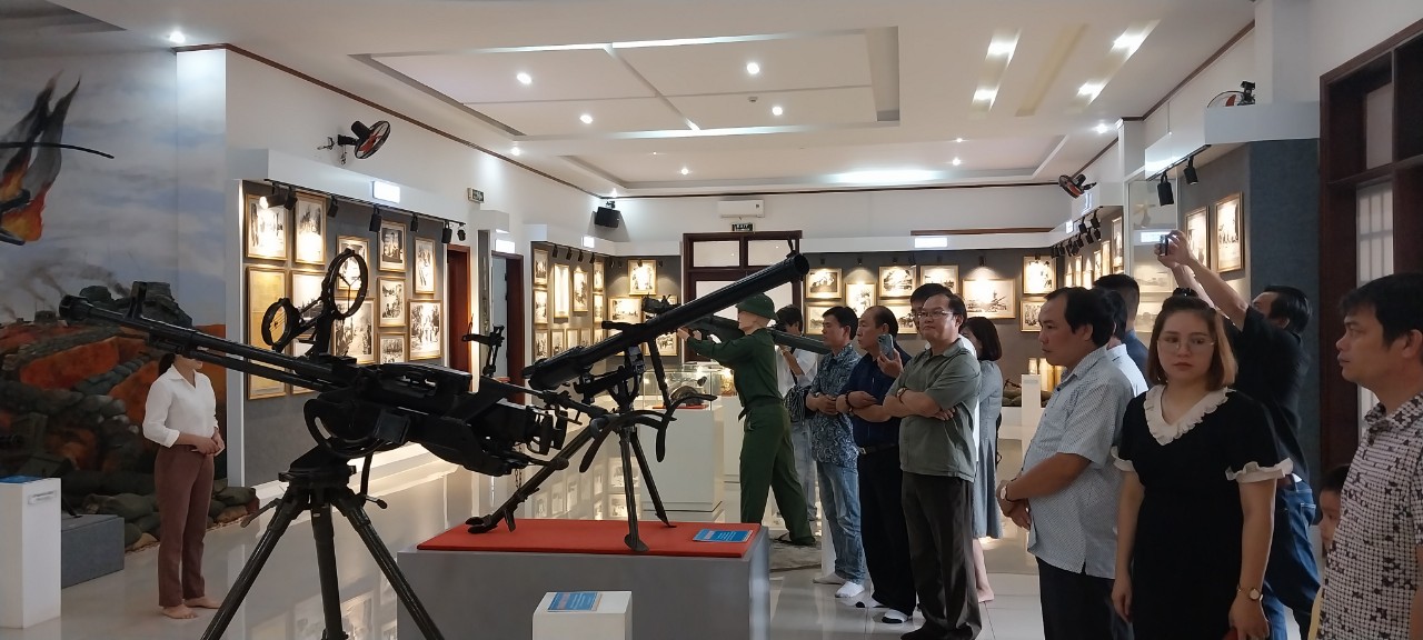 Khách tham quan tập trung lắng nghe thuyết minh về nội dung trưng bày