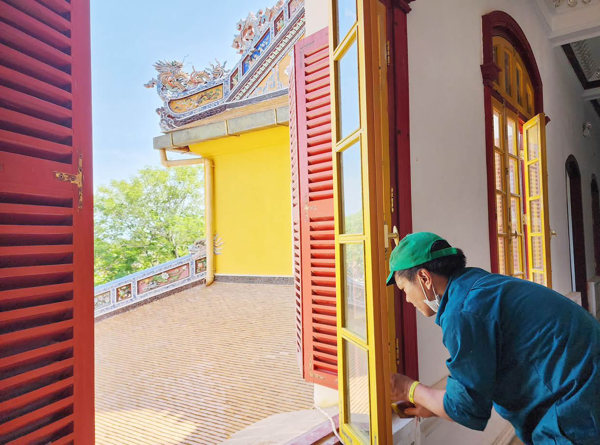 Thợ thủ công thi công tỉ mỉ tại công trình di tích |