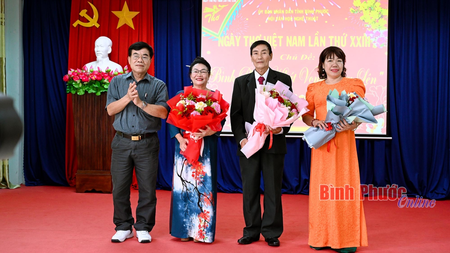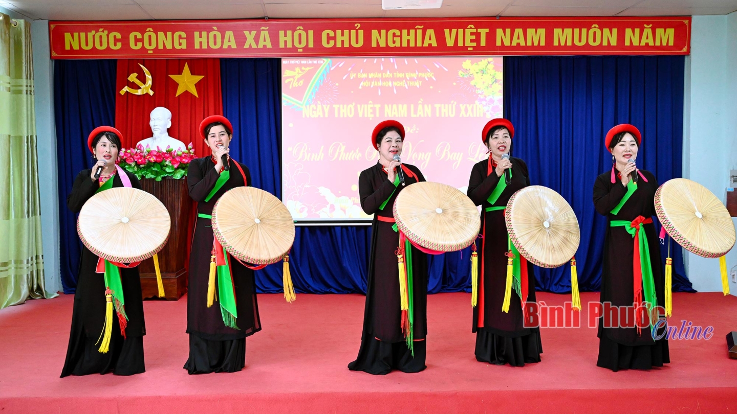 Ban tổ chức cũng vinh danh 3 hội viên của Hội VHNT tỉnh được kết nạp hội viên Hội Nhà văn Việt Nam; vinh danh nhà thơ Trịnh Loan đã có tác phẩm thơ “Bình Phước khát vọng vươn lên” được nhạc sĩ Quỳnh Hợp phổ nhạc đoạt giải A trong cuộc tuyển chọn ca khúc tiêu biểu về tỉnh Bình Phước năm 2024. Tham dự chương trình, người yêu thơ còn được hòa mình vào làn quan họ ngọt ngào của các liền chị và thưởng thức những bài thơ tiêu biểu của các hội viên Hội VHNT tỉnh qua các hình thức thể hiện độc đáo.