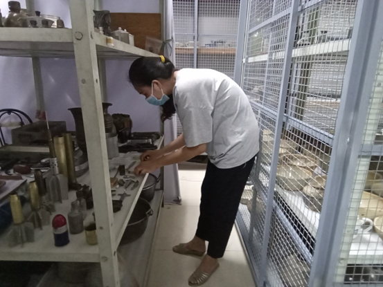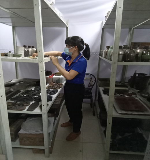 Một số hình ảnh cán bộ làm công tác kiểm kê, bảo quản và sắp sếp hiện vật tại kho cơ sở.
