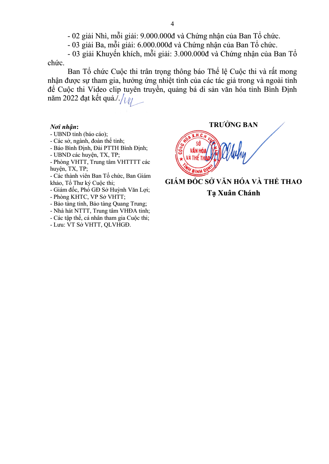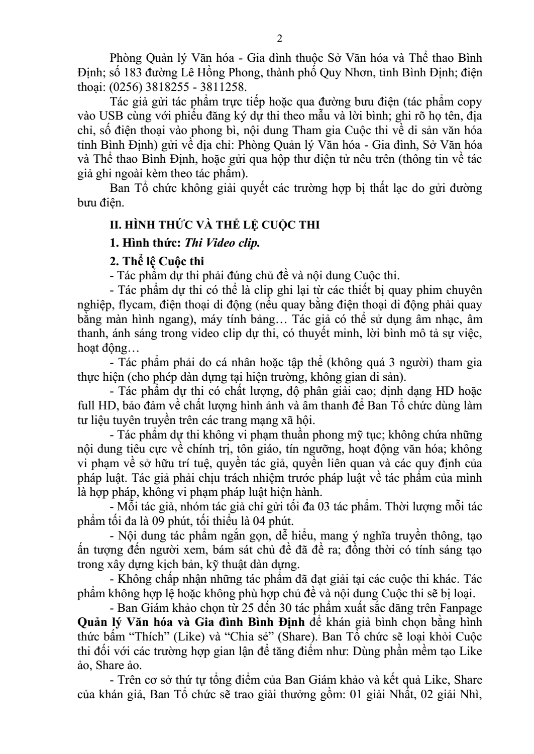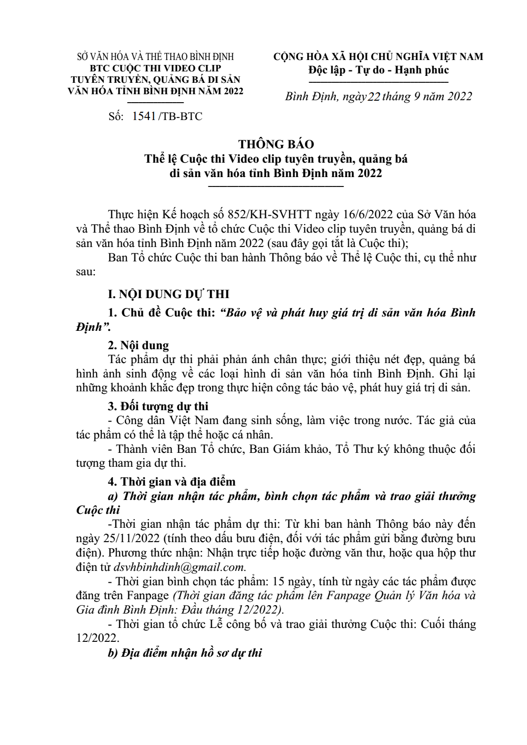 Căn cứ Kế hoạch số 852/KH-SVHTT ngày 16.6 của Sở VH-TT về tổ chức Cuộc thi Video clip tuyên truyền, quảng bá di sản văn hóa tỉnh Bình Định năm 2022; Quyết định số 319/QĐ-SVHTT ngày 16.9 của Sở VH-TT về việc thành lập Ban Tổ chức Cuộc thi Video clip tuyên truyền, quảng bá di sản văn hóa Bình Định, ngày 22.9, Ban Tổ chức đã ban hành Thông báo số 1541/TB-BTC về Thể lệ Cuộc thi Video clip tuyên truyền, quảng bá di sản văn hóa tỉnh Bình Định năm 2022.