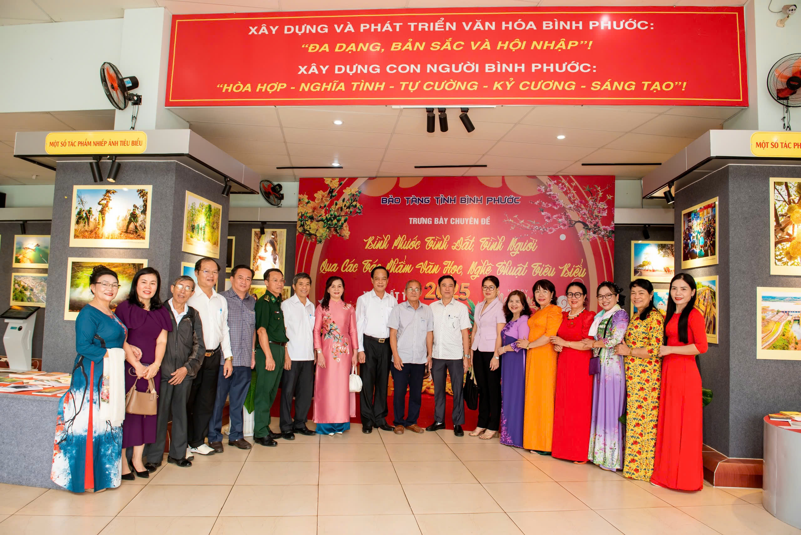 Các đại biểu được tham quan phòng trưng bày chuyên đề với chủ đề:“Bình Phước tình đất, tình người qua các tác phẩm văn học, nghệ thuật tiêu biểu”, các văn nghệ sỹ đã rất vui mừng khi thấy các tác phẩm của mình được trưng bày, giới thiệu đến đông đảo khách tham quan và đánh giá rất cao về công tác trưng bày của Bảo tàng. Không gian trưng bày với 04 cụm chủ đề chính là mỹ thuật, nhiếp ảnh, văn học và âm nhạc với hơn 70 tác phẩm nhằm giới thiệu đến khách tham quan các hình ảnh đẹp, ý nghĩa về “vùng đất và con người Bình Phước”.