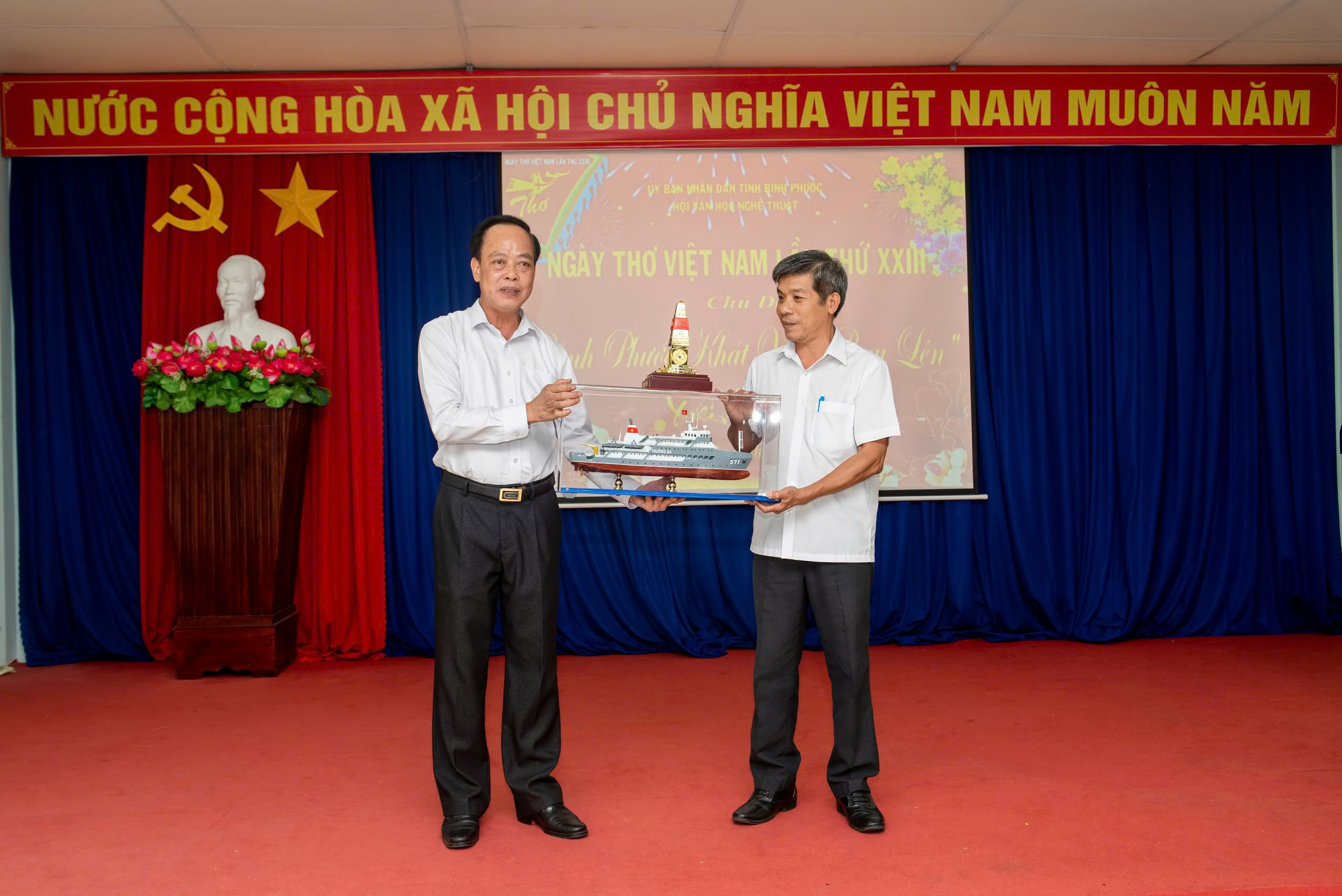 Uỷ viên BTV Tỉnh Ủy – Trưởng Ban Tuyên giáo Tỉnh Ủy Vũ Tiến Điền tặng mô hình con tàu Hoàng Sa, Trường Sa cho Bảo tàng tỉnh phục vụ công tác trưng bày