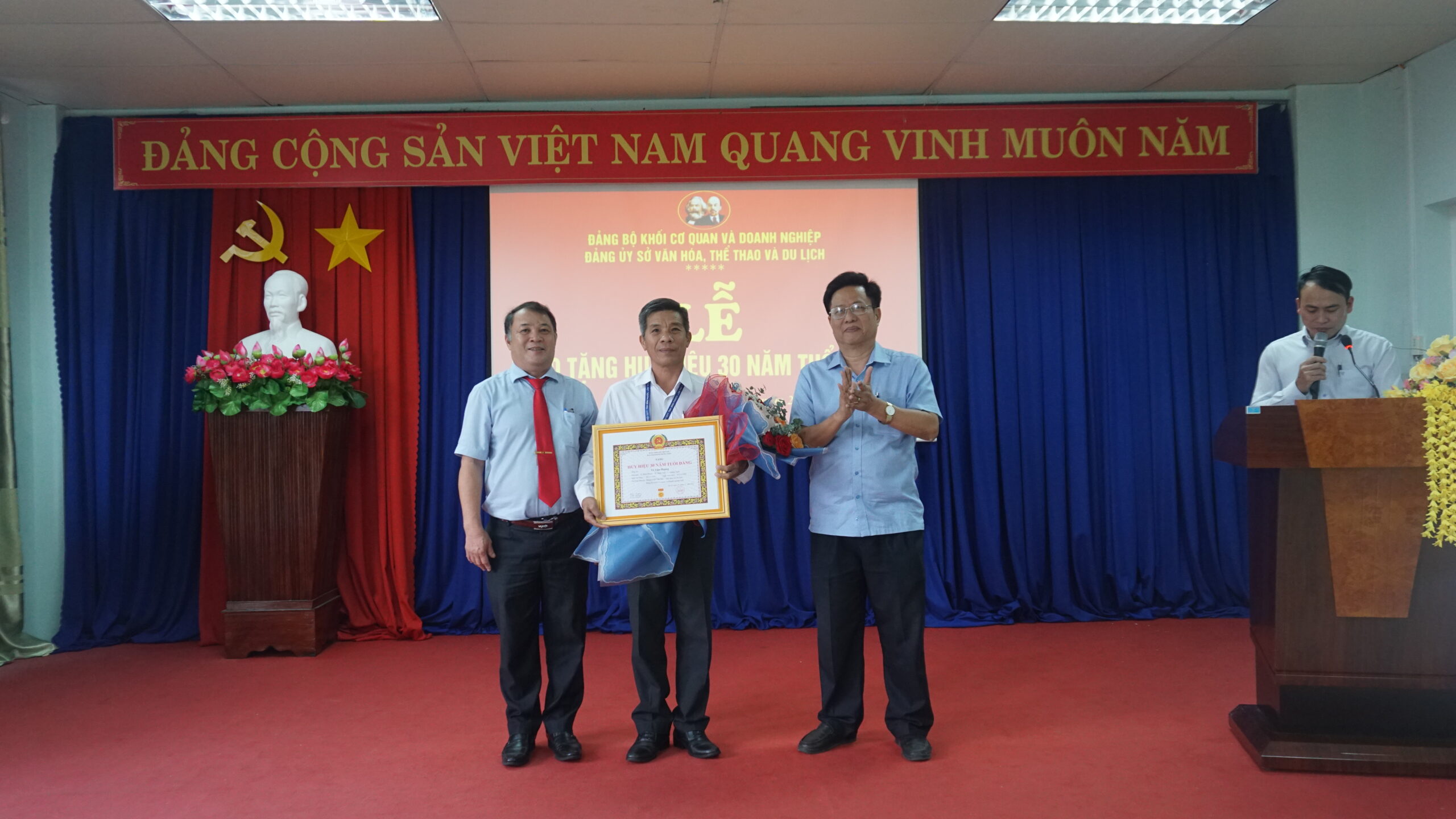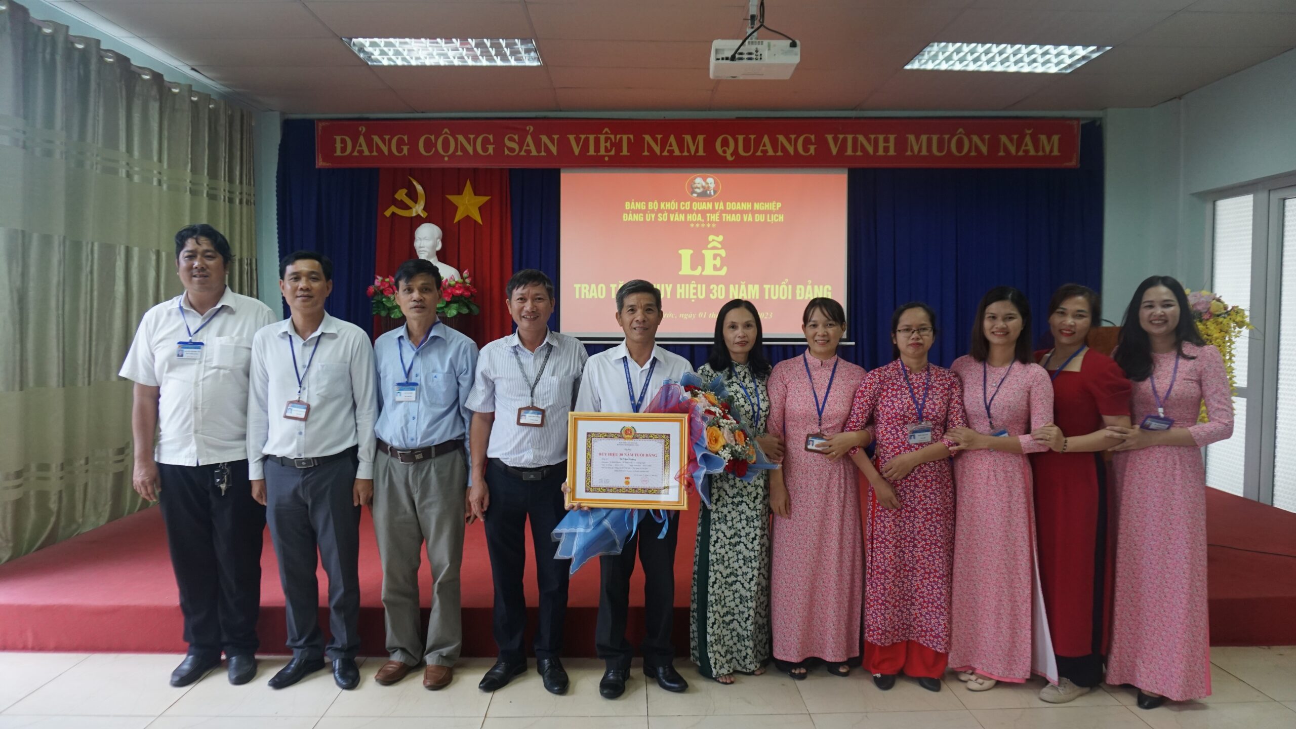Hôm này, ngày 01/3/2023 tại Bảo tàng tỉnh Bình Phước, Đảng ủy Sở Văn hóa, Thể thao và Du lịch tổ chức Lễ trao huy hiệu 30 năm tuổi Đảng cho đảng viên Tô Văn Hoàng – Đảng ủy viên, Bí thư chi bộ Bảo tàng tỉnh. Đến dự buổi lễ có đồng chí Nguyễn Phúc Bảy – Phó Bí thư đảng ủy Khối Cơ quan và Doanh nghiệp tỉnh, đồng chí Trần Văn Chung – Bí thư Đảng ủy – Giám đốc Sở Văn hóa, Thể thao và Du lịch và các đồng chí Ủy viên Ban chấp hành Đảng bộ Sở Văn hóa, Thể thao và Du lịch cùng toàn thể đảng viên Chi bộ Bảo tàng tỉnh.