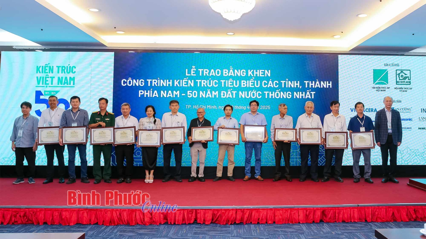Bà Ngô Thị Phương Thảo, Phó Chủ tịch Chi hội Kiến trúc sư tỉnh Bình Phước (thứ 6 từ trái qua) nhận bằng khen công trình kiến trúc tiêu biểu thuộc các tỉnh, thành phố khu vực phía Nam đối với Khu bảo tồn văn hóa dân tộc S’tiêng sóc Bom Bo