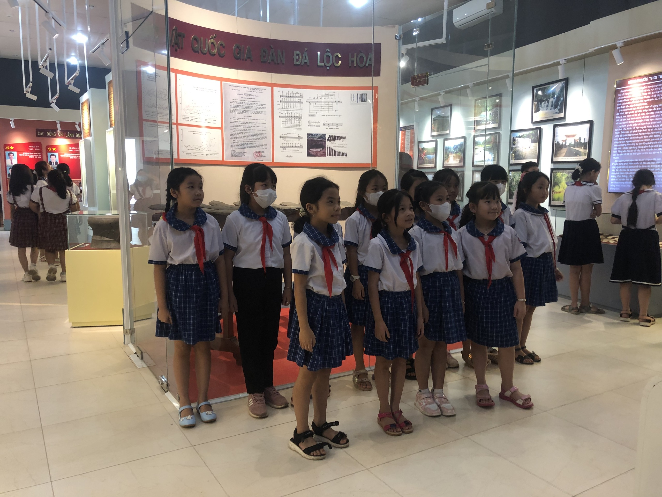 Tại đây các cán bộ thuyết minh đã giới thiệu cho các em về tổng quan Bình Phước thông qua những hình ảnh, tư liệu, hiện vật thể hiện quá trình hình thành và phát triển của tỉnh, các mốc son lịch sử trong công cuộc đấu tranh giải phóng dân tộc của quân và dân tỉnh Bình Phước, các phong tục, tập quán của một số dân tộc sinh sống trên địa bàn tỉnh tại không gian phòng trưng bày “Di sản Văn hóa Bình Phước”. Đặc biệt là bộ đàn đá Lộc Hoà (Bảo vật Quốc gia)…