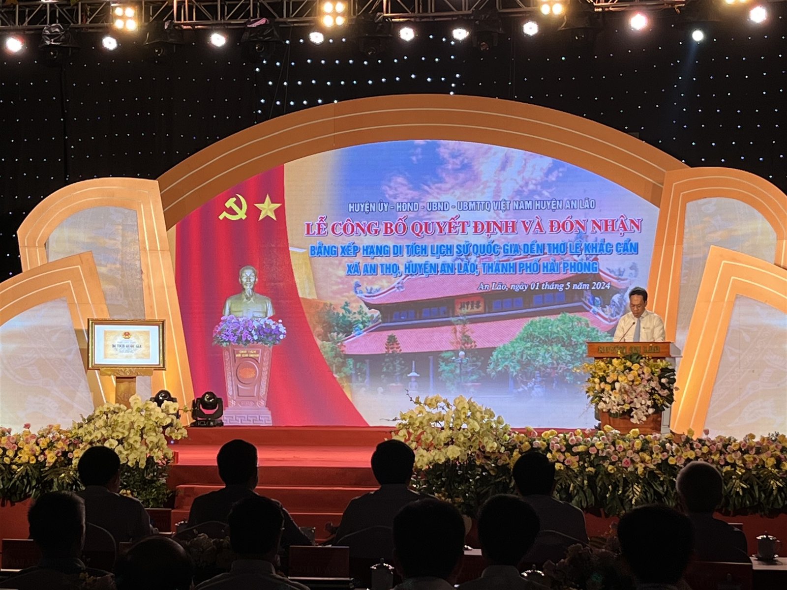 Tối ngày 01/5/2024, tại di tích Đền thờ Lê Khắc Cẩn, xã An Thọ, huyện An Lão, thành phố Hải Phòng, Huyện ủy – Hội đồng nhân dân – Ủy ban nhân dân – Ủy ban Mặt trận Tổ quốc Việt Nam huyện An Lão đã tổ chức Lễ đón Bằng xếp hạng di tích lịch sử quốc gia Đền thờ Lê Khắc Cẩn.